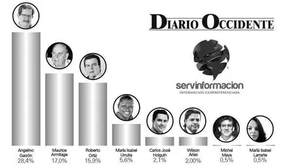 Entre los candidatos el primer lugar en intención de voto lo mantiene Angelino Garzón, del Partido de la U, con el 28,4%; seguido de Maurice Armitage, independiente, con el 17,00%; Roberto Ortiz, del Partido Liberal, con 15,9%; María Isabel Urrutia, del Mais, con 5,6%; Carlos José Holguín, del Partido Conservador, con 2,1%; Wilson Arias, del Polo Democrático Alternativo, con 2,00%; Michel Maya, de la Alianza Verde, con 0,50%, y María Isabel Larrarte, de Aico, con 0,5%.