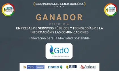 Para el premio de Eficiencia Energética, Gases de Occidente presentó su proyecto de Movilidad Sostenible, a través del cual se generan soluciones energéticas que contribuyen al desarrollo social y económico de la región con flotas de vehículos con motores dedicados a gas natural para el transporte masivo de pasajeros y de carga, logrando beneficios económicos y ambientales para nuestros clientes en diferentes sectores productivos.