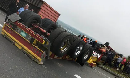 El vehículo de color amarillo quedó atravesado en la carretera, por lo que los Bomberos y la Policía de tránsito llegaron a atender la emergencia y tratar de sacar el conductor que había quedado atrapado en la cabina del camión. Infortunadamente, el conductor falleció en el siniestro vial.